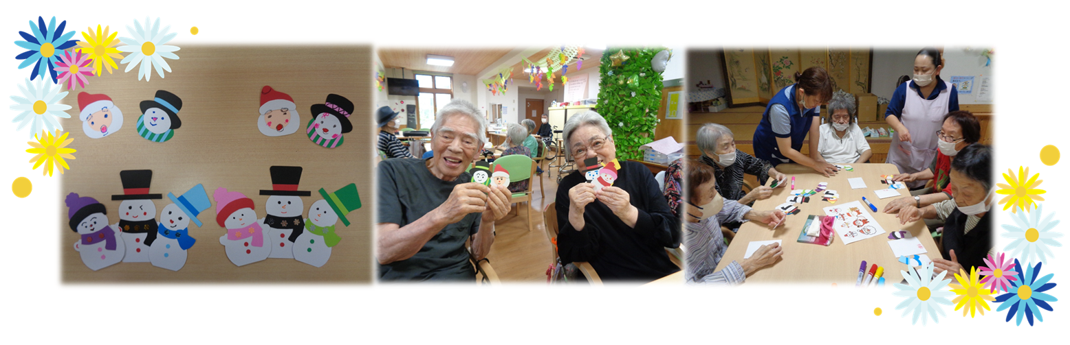 本日のレクリエーションは工作😊 12月から居室のドアにかける飾りを作ります。雪だるま、サンタクロースに目や口を書きました🖍️ 可愛い顔やちょっと笑える顔⛄ どれも味があって最高です❗ 出来上がりをお楽しみに😊