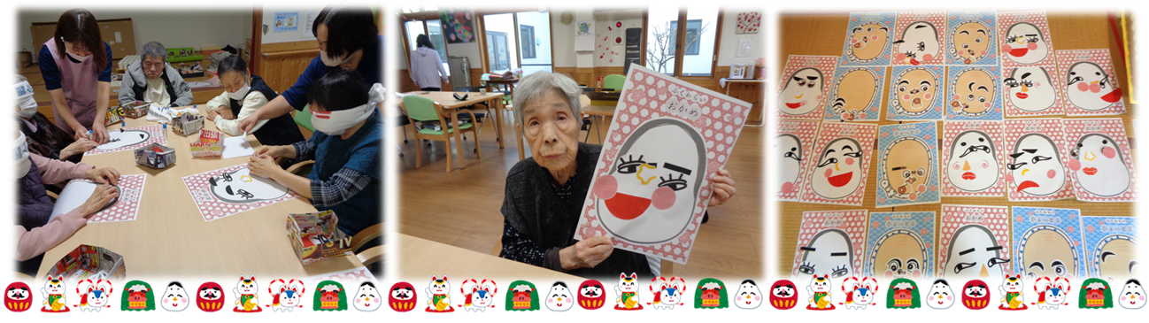 お正月遊びのひとつ「福笑い」をしました。 目隠しをして挑戦です 「上手く出来た❗」、「何?この顔😆」と大笑い。それぞれ楽しいおかめとひょっとこが出来ました😊 今年も一緒にたくさん笑いましょう😄