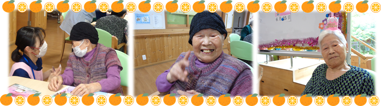 A:1番目はデイサービスで周りの皆さんと会話出来る事が楽しいです。2番目は栄養のバランスがとれた食事で美味しいです😊3番目は職員さんから良くしてもらい、嬉しいです💕