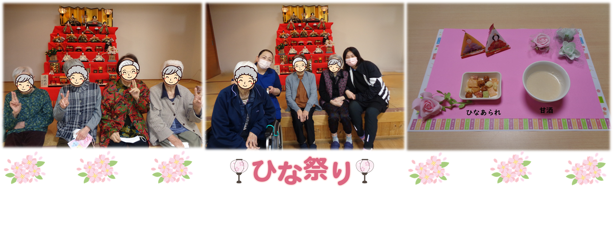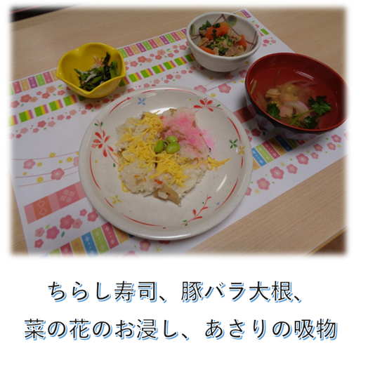 女性入居者様が3分の2を占めている『おとひめの森』では、無病息災を願ってお祝いをしました❤️ "ちらし寿司"といった行事メニューに"甘酒"や"ひなあられ"をいただき、七段飾りと一緒に記念撮影✨ 🎵今日は楽しいひな祭り~🎶